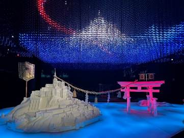 今回は入ることができたパビリオンは、フランス館、トルクメニスタン館、アメリカ館の3つです。最初に訪れたフランス館は、環境への影響を最小限に抑えるように設計されたそうで、正面にあるピンクゴールドのスロープの曲線が美しい建物でした。館内にはいくつかの展示空間があり、そのひとつであるDiorのスペースには、本学の卒業生である妹島和世さんの作品も飾ってありました。中でも特に惹かれたのは「群島をたどって、響く鼓動」という展示です。島をかたどった3つのコンセプトで構成され、フランスと日本の愛の絆を体現しているとのことでした。きらきらと輝くLEDの雲の下で、モン・サン=ミッシェルと厳島神社の鳥居が繋がる光景はとても幻想的で、自然・環境問題・アートを融合した展示がいかにもフランスらしいと感じました。