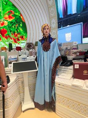 次に訪れたトルクメニスタン館では、カーペットや民族衣装、アクセサリーなどの装飾品を通して、中央アジア独自の文化を垣間見ることができました。パビリオンに入ると、目の前に大統領の肖像画が飾られていたのが印象的で、他の館にはあまりない独自性を感じ、面白かったです。また国の象徴である犬の「アラバイ」が推されているのか、大型スクリーンの映像や展示室の壁、お土産コーナーではその可愛らしい姿を多く見かけました。