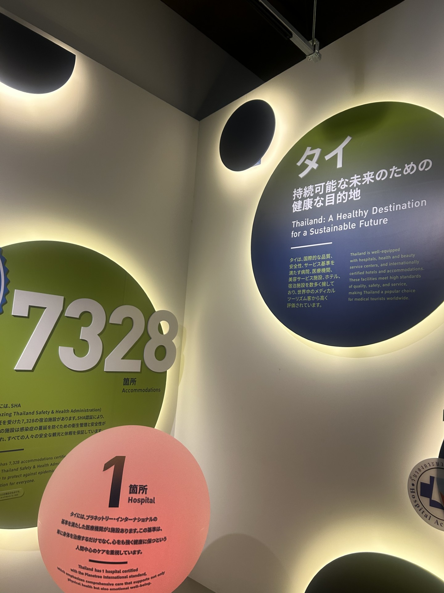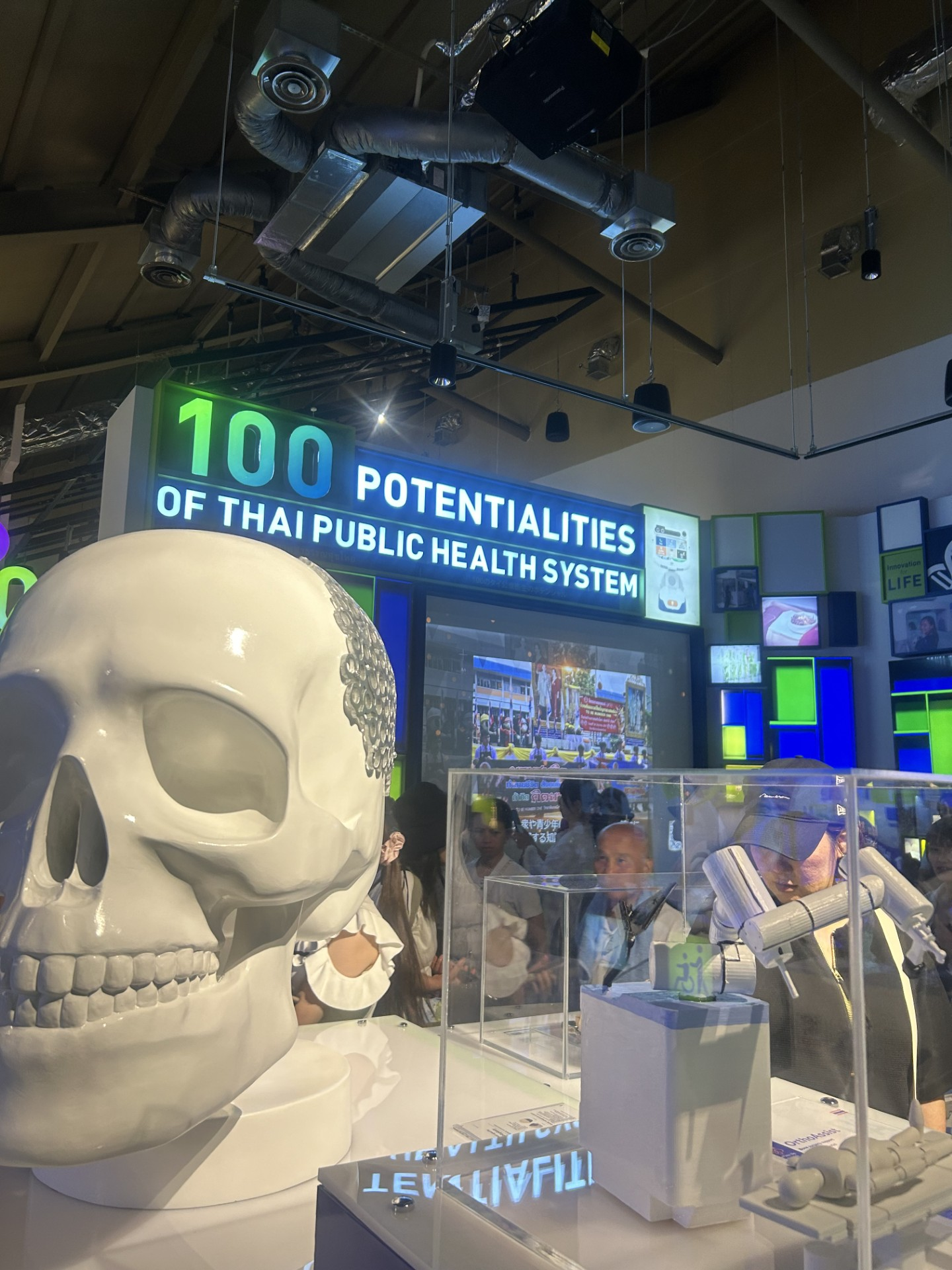 タイ館は、寺院のような装飾が目を引く建物で、「よい食事、豊かな生活、免疫力の高い国タイ」をテーマにしていた。中に入るとスパイスの香りが漂い、市場の中に迷い込んだような感覚に包まれた。展示では、伝統行事や食文化に加え、医療や健康づくりにも焦点が当てられていた。タイが健康関連活動部門で世界第2位だというのは初めて知った。健康状態をチェックできるブースもあり、「食の国」という印象の裏に、生活の質を重視する国民性を感じた。タイの伝統的な食文化や公衆衛生。そして今のタイ医療。過去と未来に目を向けた展示であった。